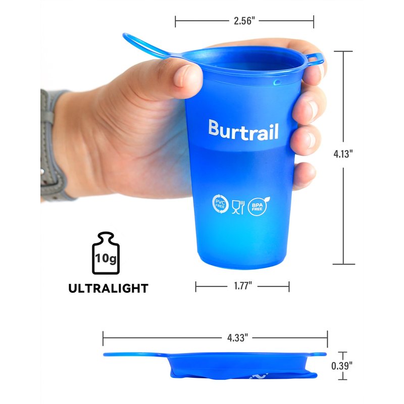 Our Burtrail collapsible cup is made of food-grade TPU materials.It easily fits in their running shorts pocket, it's lightweight and doesn't take up much space when folded flat,the included hook allows you to hang the cup on the running vest or bag.Portable drinking cup for trail running,marathon running,backpacking,traveling,cycling,climbing.This flexible running cup collapse to only 0.39 inch.Can also be frozen or filled with hot water (max temp 60° C / 140° F)