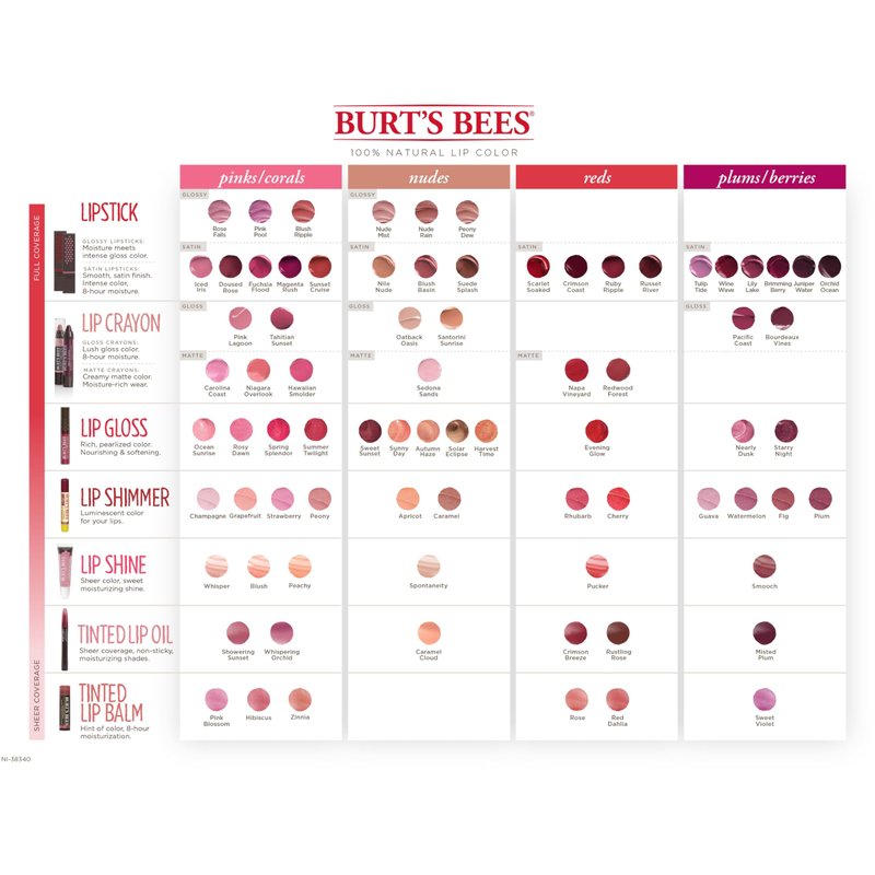 - LIP GLOSS: Glide on instant, creamy color with Burt's Bees Gloss Lip Crayon that delivers the moisture of a balm and color of a lipstick