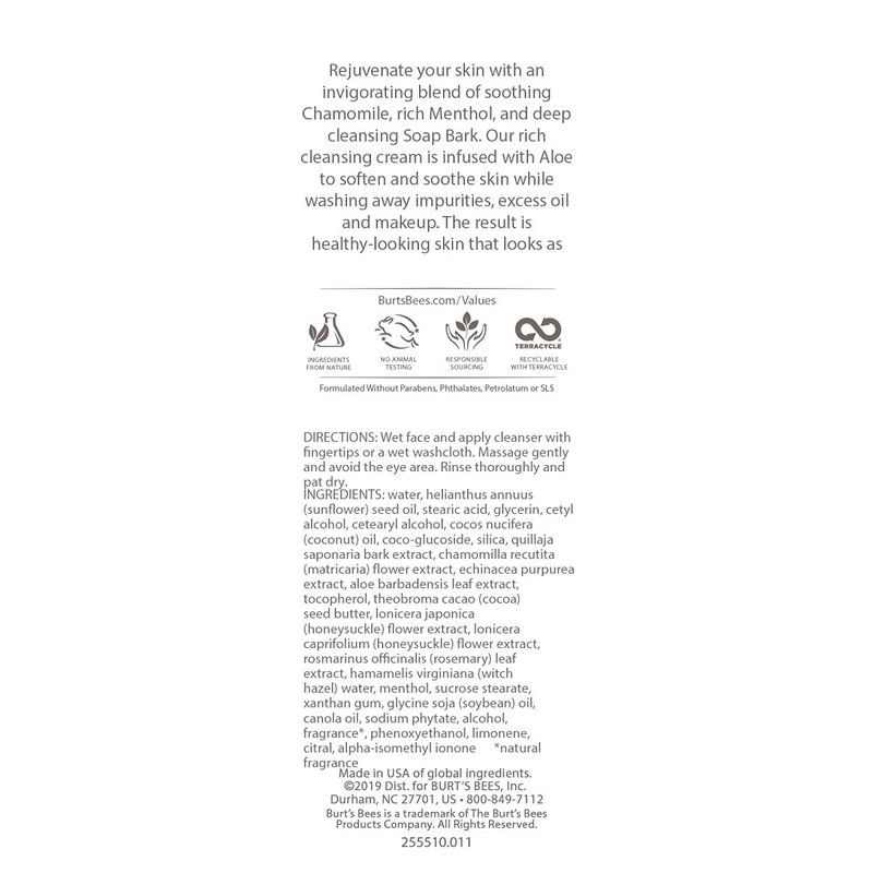 - CREAM FACIAL CLEANSER: Burt's Bees soap bark and chamomile creamy facial cleanser contains a hint of menthol to help cool and soothe leaving skin looking naturally healthy and beautiful