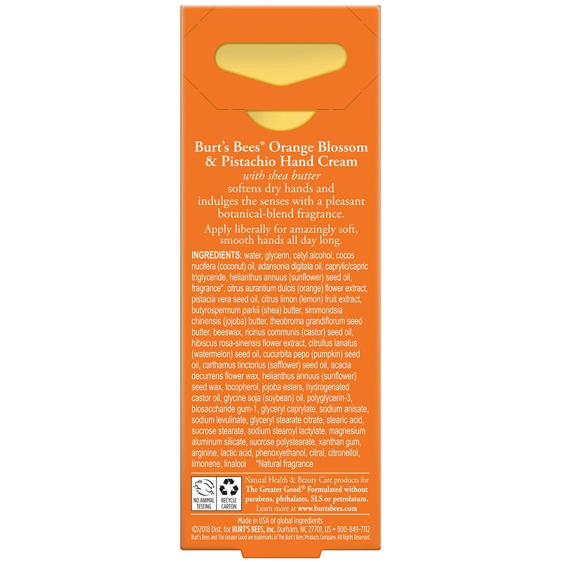 - BURT’S BEES ALL DAY MOISTURIZATION: With the aromatic scent of orange blossom & pistachio, Burt’s Bees shea butter hand cream is a luxurious, moisturizing cream that nourishes dry hands; Package may vary