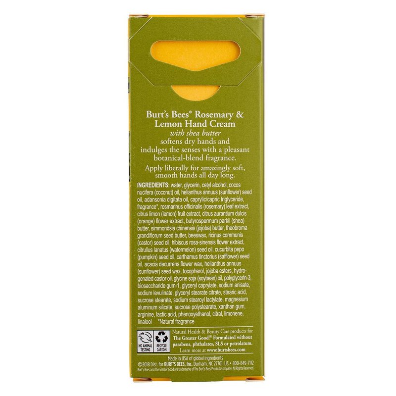 - BURTS BEES ALL DAY MOISTURIZATION: With the aromatic scent of rosemary and lemon, Burts Bees shea butter hand cream is a luxurious, moisturizing cream that nourishes dry hands leaving skin soft; Package may vary