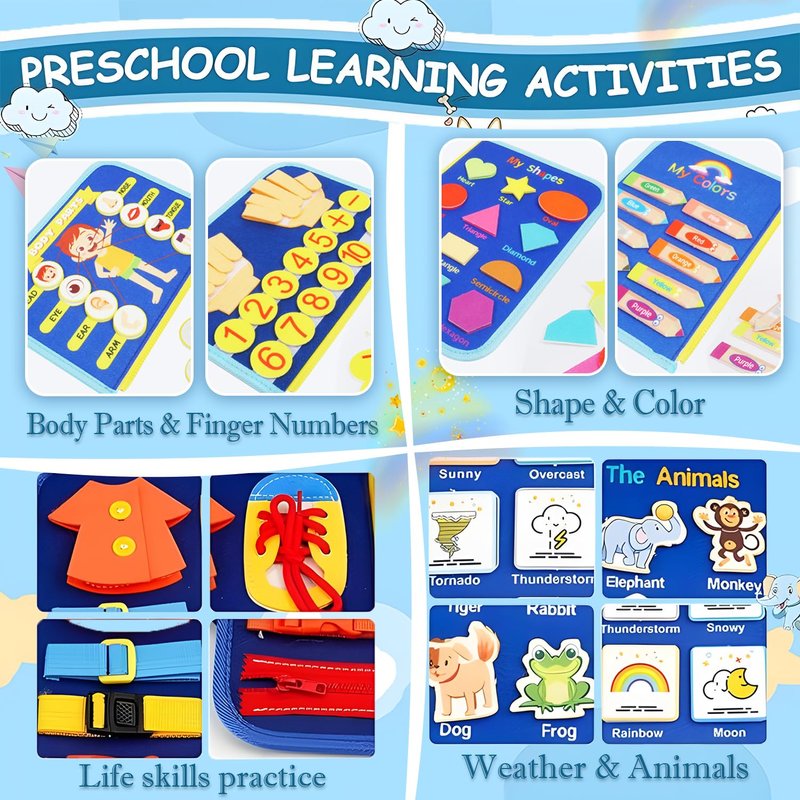 - 🌠Play While Learning: This busy book for toddlers 1-3 develops basic skills such as dressing oneself, putting on shoes, improving motor skills and finger dexterity. The finger number teaching pages help enhance your kid's numeracy skills. The clock, animal and seasonal weather pages improve cognitive skills. Parents can play the Shape Matching page and Color Matching with your child, which improves recognition skills and is the perfect activity for bonding with your toddler!