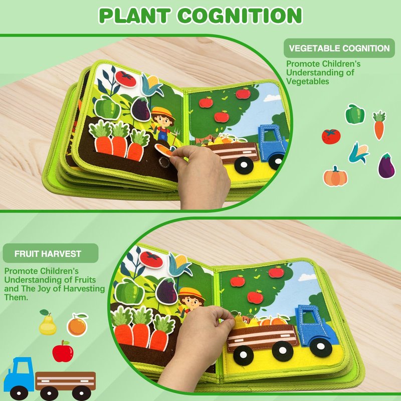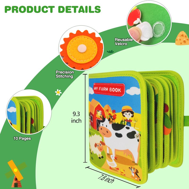 - 20-in-1 Farm Themed Busy Book: This busy book with a farm as the background has 10 interactive pages and 20 activities, Dimensions: 9.3*7.8 inches. It teaches children essential life skills through various forms of activities, attracts children's attention, cultivates their hand-eye coordination, problem-solving ability and fine motor skills, improves children's concentration, and it can better promote children's brain development