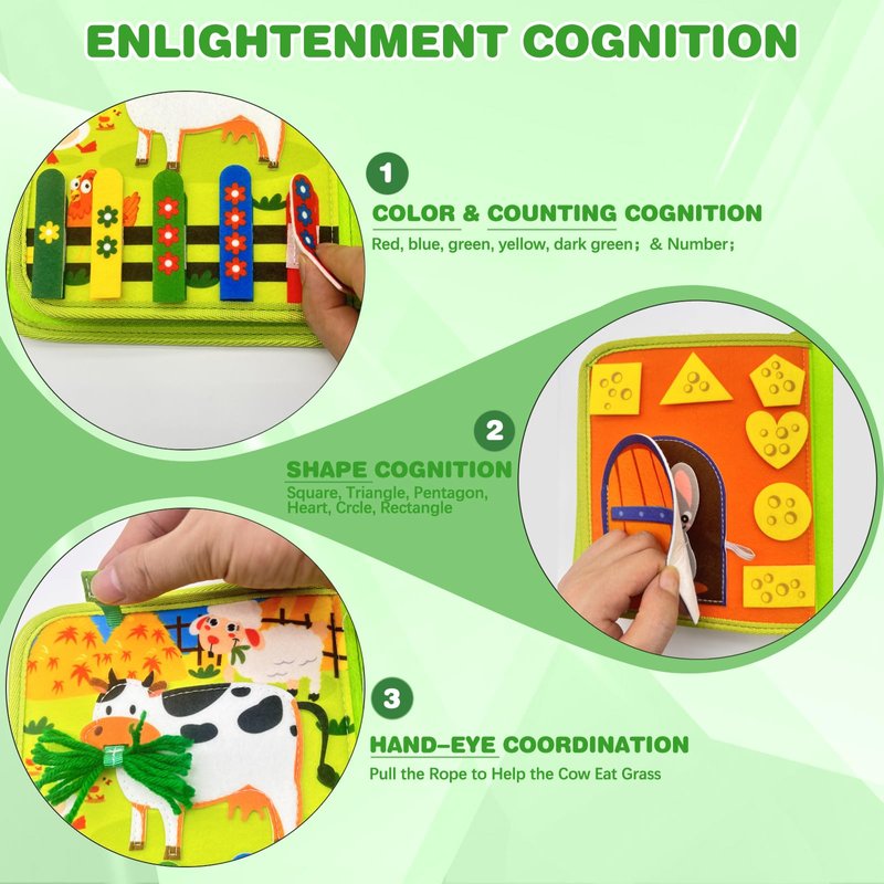 - Cultivate Practical Life Skills: This Montessori farm busy book designed for Toddler contains multiple life skills pages, such as dressing, tying shoelaces, buttoning, zipping, help children learn common sense in life. Montessori Toys Busy Board attracts children's attention through three-dimensional patterns and bright colors, and cultivates their good living habits. This is a very good educational book