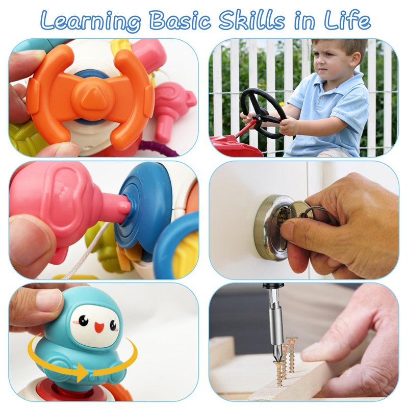 - 【Montessori Busy Toys】: This Montessori toy set features 8 activity panels offering diverse experiences, including an extendable rocket, a rotating steering wheel, a simulated plug, a squeeze button, a pushable spaceship, and a spinning spinner. Ideal for baby, these toys captivate and entertain children for hours, fostering creativity and imagination.