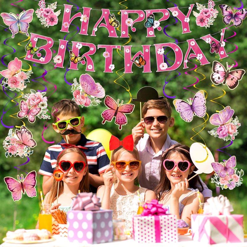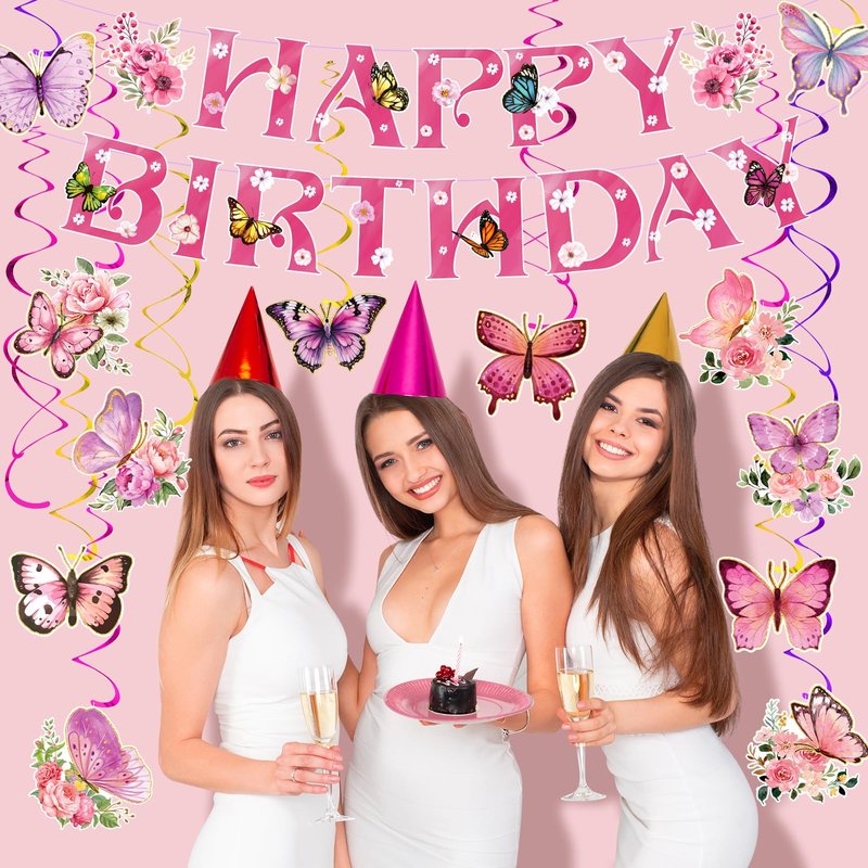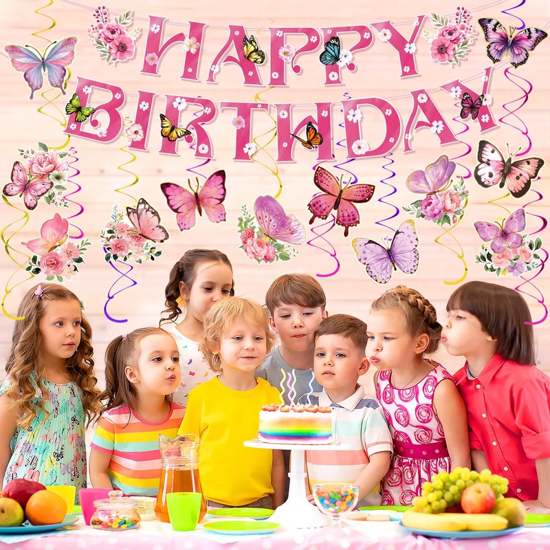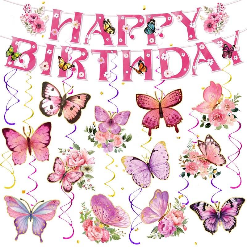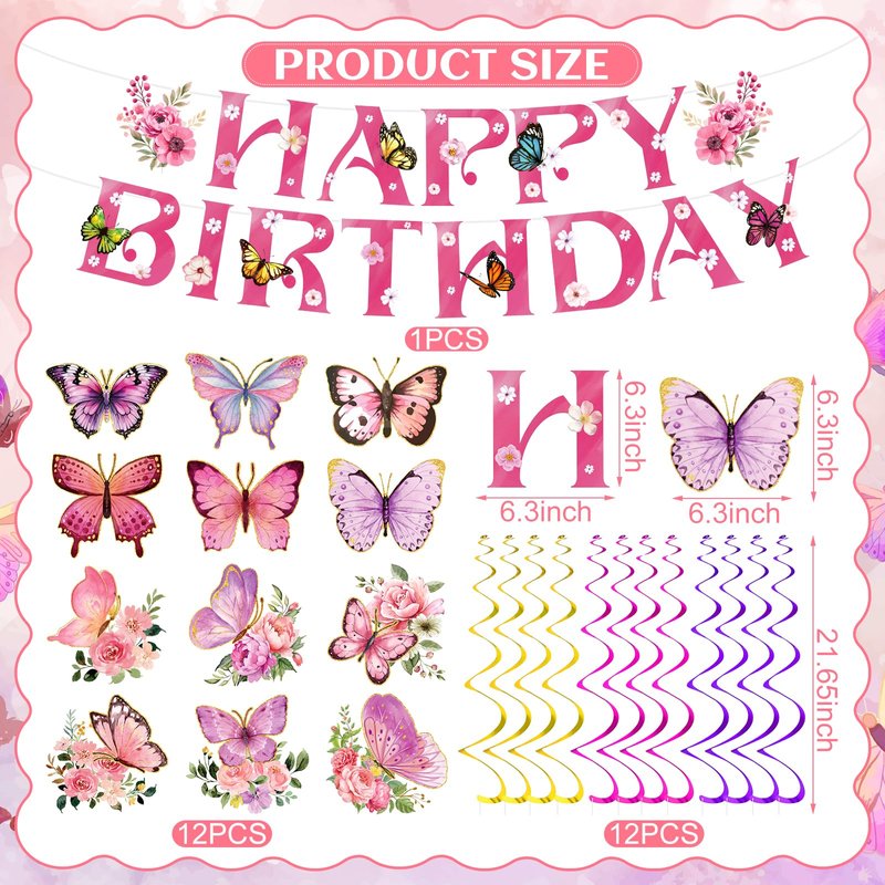- 🦋【Package Includes】With the butterfly birthday decorations for kids and girl, you will receive 1pcs pink Happy Birthday banner and 12 pcs butterfly cardstocks in 12 diverse styles and 12 pieces hanging swirls in 3 colors: pink, gold and purple.