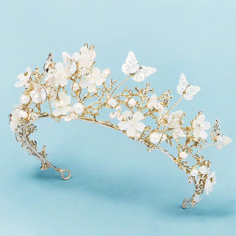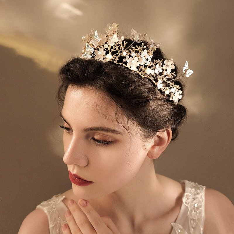 Butterfly Flower Tiara Bride Crown For Women Rhinestone Pearl Tiara For Girls Bridesmaid Fairy Crown Headband Wedding Birthday Party Jewelry Hair Accessories(Gold)