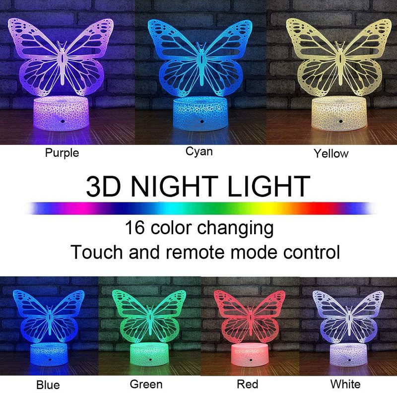 - Smart touch button & remote control -- You can touch the button on butterfly lamps base for 7 colors changing and use remote control for 16 colors changing.Our butterfly 3d night light will light up your whole night to provide relaxed sleeping atmosphere.
