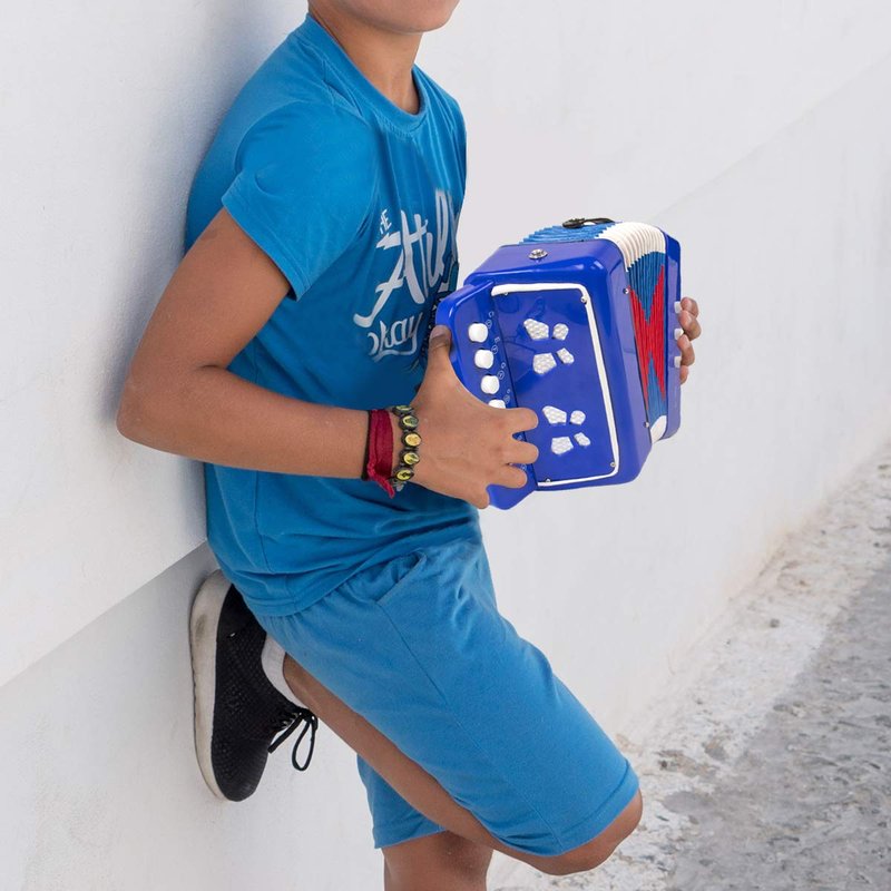 - Perfect detailed design: High-quality bellows, sturdy and durable, made of safe materials. 7 buttons can meet the needs of general music. Belt buckle, untie when you want to use it, and close it when not in use. The soundhole, when you play this accordion, a beautiful concert comes from the soundhole.