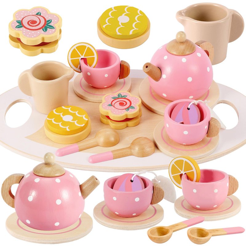 - Pretend Play Afternoon Tea Party Set: 1 teapot and matching lid, 2 teacups, 1 milk cup, 3 coasters, 2 spoons, 4 wooden food accessories, 1 tray and 1 box. Use kid's imagination and enjoy hours of play time.