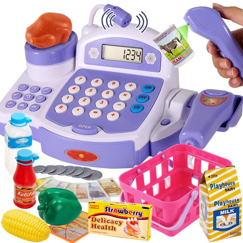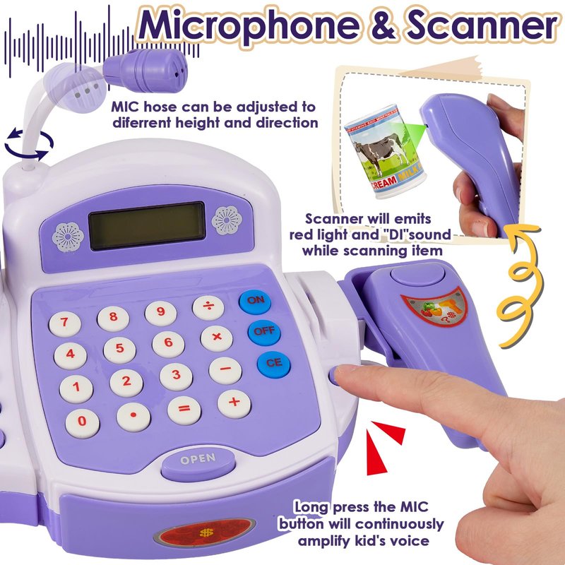 BUYGER Toy Cash Register for Kids with Real Calculator, Light and Sound Scanner, Microphone, Pretend Play Shopping Food Toys - Cashier Playset Gifts for Ages 3 4 5