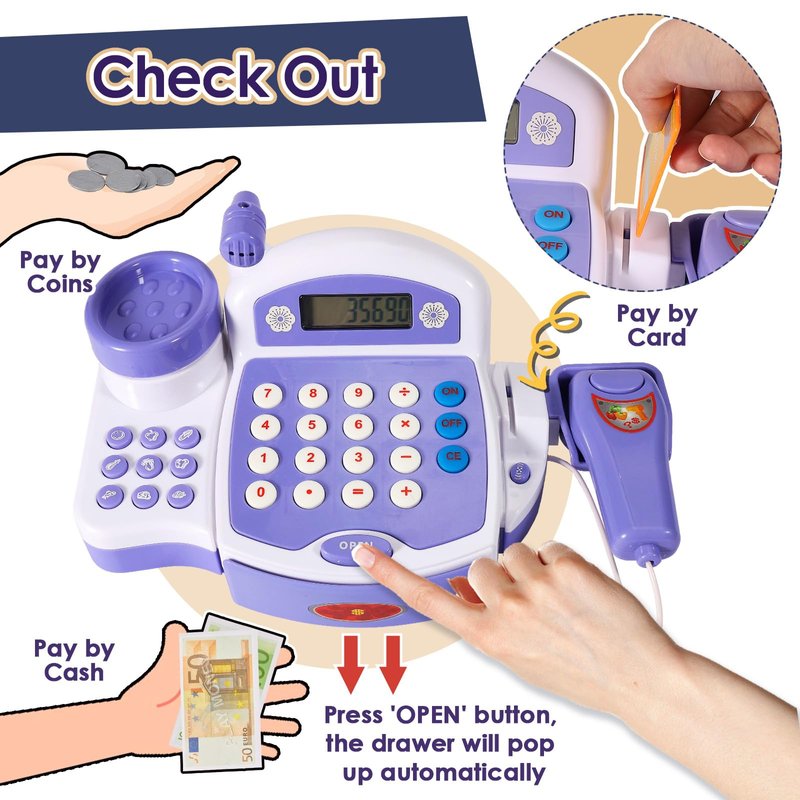 - ●【4 - Supermarket Checkout】 - Press the "OPEN" button, the drawer will pop-up automatic, use play money / coin / credit cards to finish payment and closed drawer, complete your supermarket shopping!