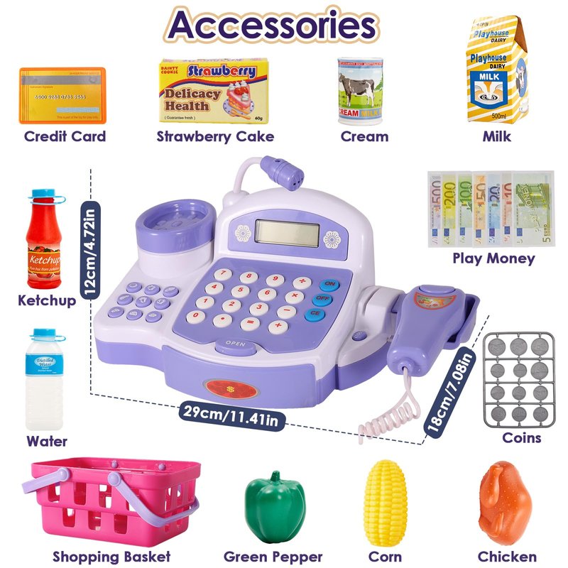 - ●【Pretend Play Kids Cash Register Toys】 - 29x21.5x12 cm(11.42x8.46x4.72 inches). High quality and suitable for small hand, multifunctional toy cash register allows children to enjoy hours of playtime.