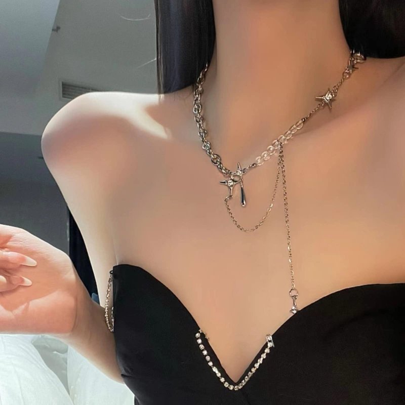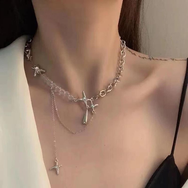Buyongwant Irregular Star Pendant Necklace Y2k Beads Silver Metal Women's Design Collar Chain Fashion 15.75 Inch