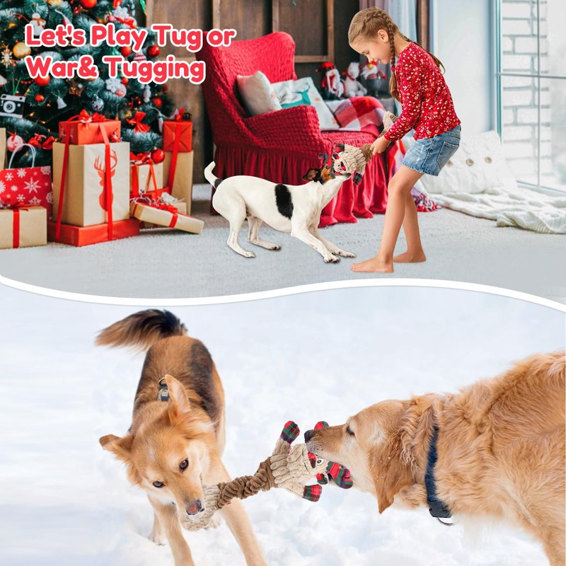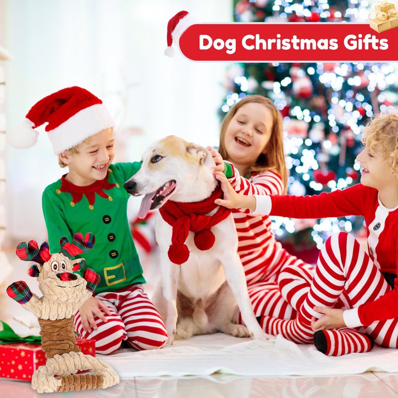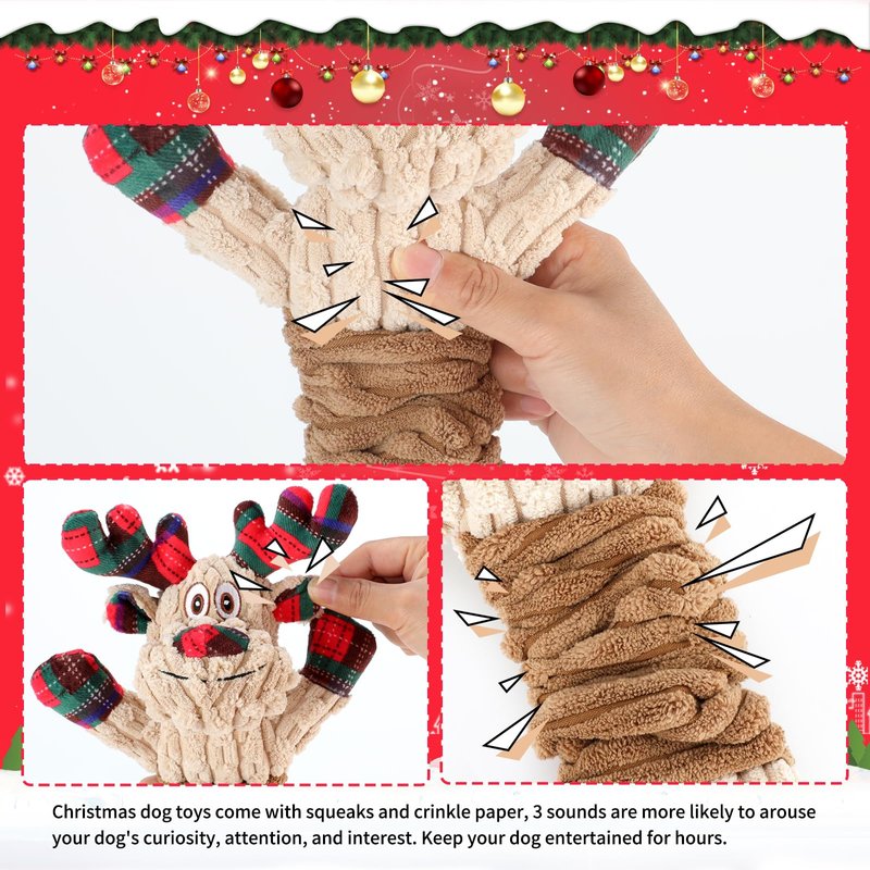 - Christmas dog toys: Built-in squeak, body and ears with wrinkled paper sounds. Dog toys with multiple sounds will instantly capture your dog's attention. Stimulate their hunting instincts and chewing behavior, keep the fun of playing. Reduce the chances of pets chewing on sofas, pillows, shoes, etc. and keep your home clean and tidy.