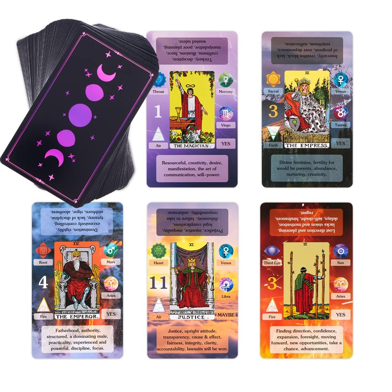 - 【Learn Tarot Cards Easily】Tarot cards with Keywords, astrology (planet zodiac), Yes or No, elements, Numerology on the front of cards, These informations can quickly help you understand the each card itself, no need to spend a lot of time looking for them. If you're a beginning reader, you will love it!!