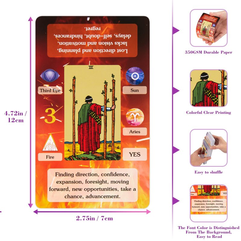 - 【High Quality Cards】Made of durable 350 GSM paper, compatible with hardness and toughness, standard tarot size (4.72*2.75 inch), easy to shuffle. Advanced printing technology, bright color patterns, clear and readable word on card.