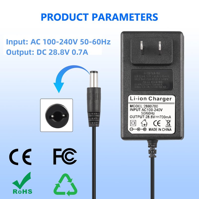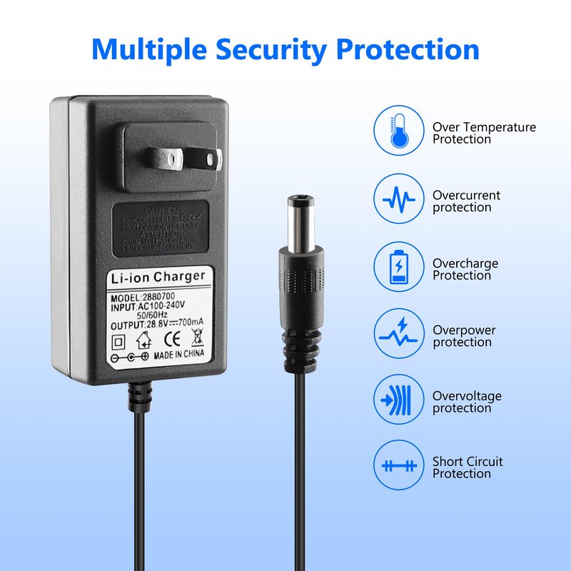 - 🔌【Product Specification】Input: AC 100-240V 50-60Hz, Output: DC 28.8V 700mA, Connector: 5.5mm*2.1mm, Cable Length: (6ft/1.8m), With Charging Indicator Light, Red Light charging, Green Light full.