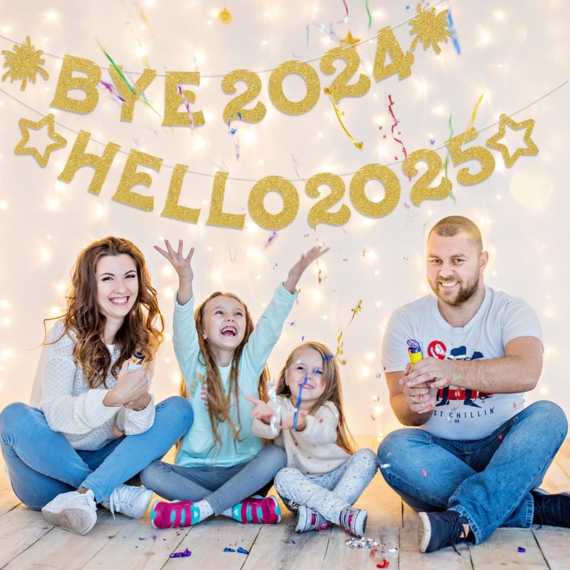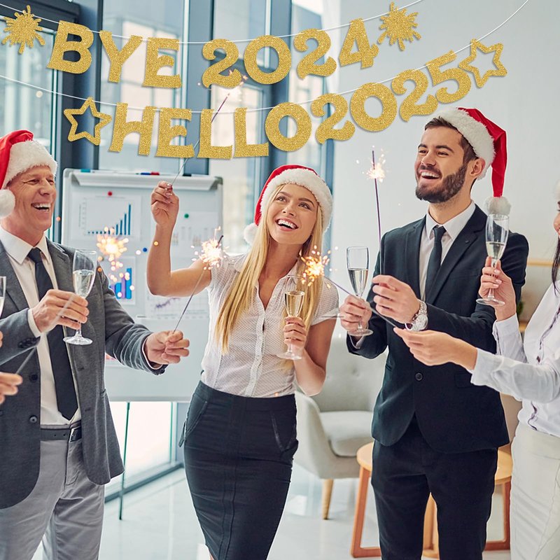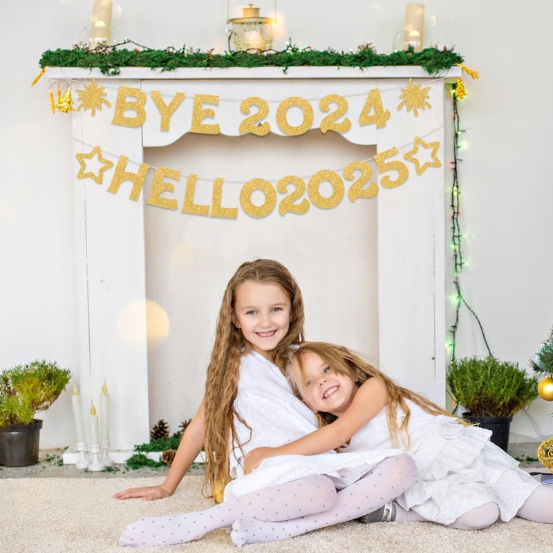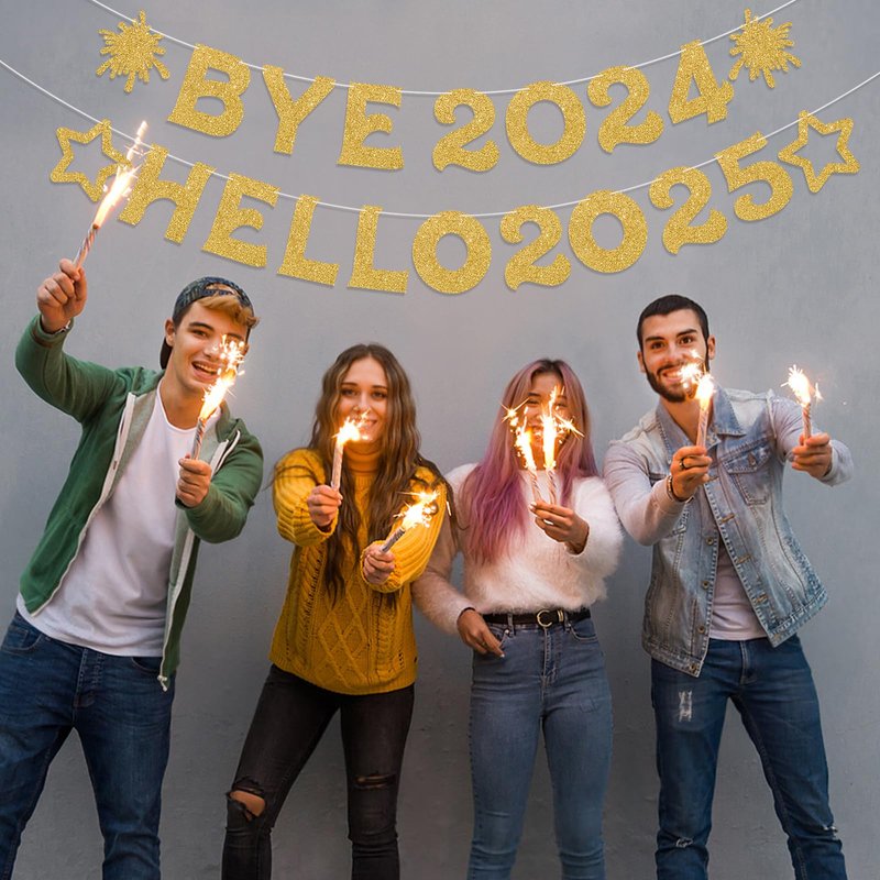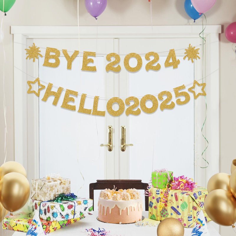 - Goodbye 2024 hello 2025 banner- You will receive 19 "BYE 2023, HELLO 2024" cards to assemble the New Year banner, greet your 2025 and say goodbye to 2024 with these shiny gold banners