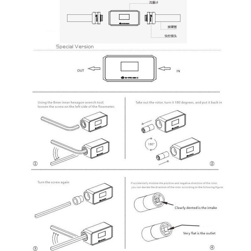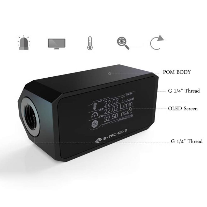 - This electronic temperature flowmeter adopts high-definition OLED display screen, withthree indexes of flow,temperature and rotation speed clearly visible.It can monitor flow,temperature and rotation speed at any time.In case of water failure,the water pump will give an alarm when it does not turn.Provide good operation guarantee for water cooling system.
