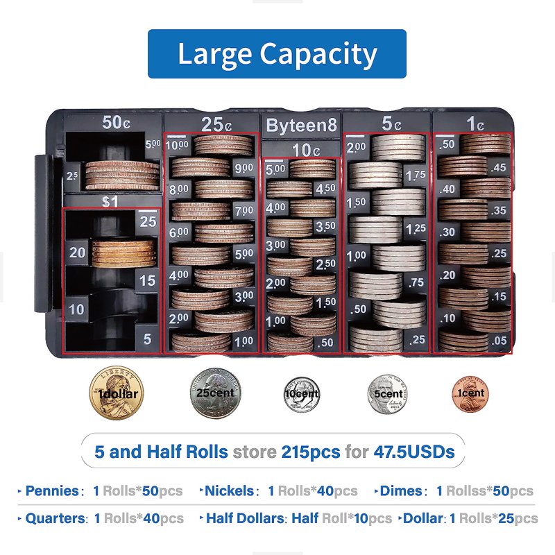 - Large Capacity: This Self-Counting Coin Tray has 5 and half Rolls with 215pcs Coins for 47.5 USDs. Small size with large capacity coin counter coin sorter. Good Coin Counters & Coin Sorters as Coin Counter Machine for you