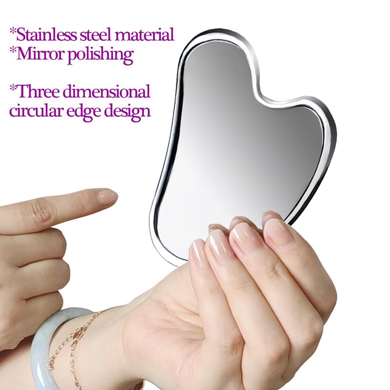 ●This Stainless Steel Guasha Tool is made of high quality medical grade stainless steel. Unlike other jade and flat stone materials, which are easily broken, The stainless steel process ensures that the tool is durable, static-free, easy to operate and clean.Facial massage tool: The Guasha tool are polished to a mirrorlike shape and they glide smoothly over the skin to help relieve tension and promote relaxation. Use with various skin care products, such as serums or essential oils. Enhanced absorption of them, making the product more effective. Improve blood circulation: Facial gua Sha Tool can dreg merchannels, strengthen muscles, reshape the face shape, promote skin metabolism, remove excess water and metabolites, ensure the skin has sufficient nutrient supply, make pores naturally shrink, skin naturally firm.