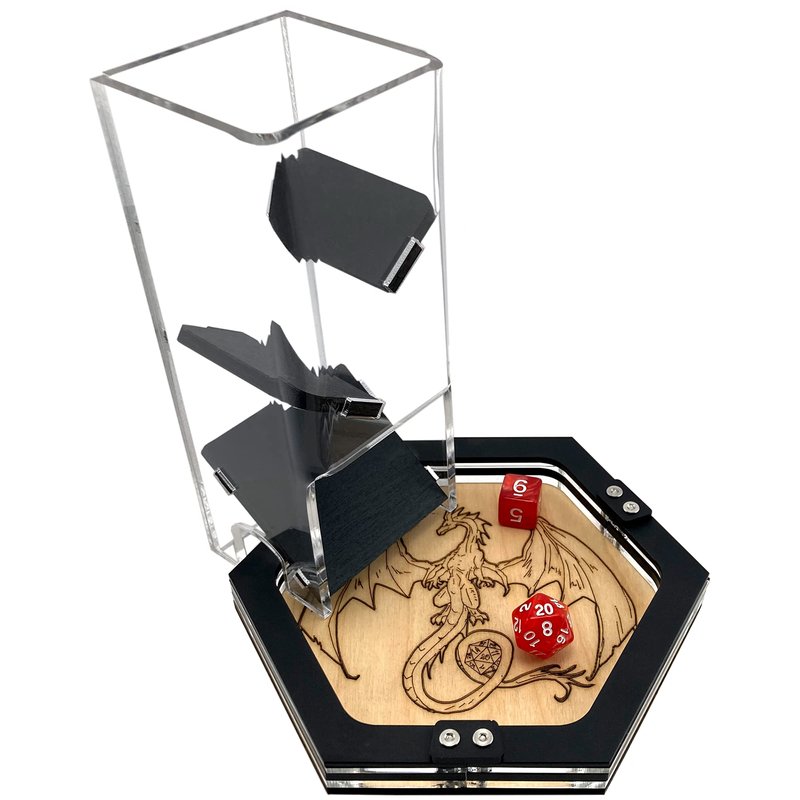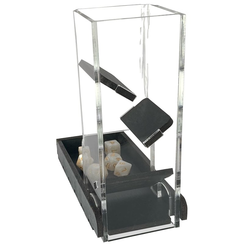 - Treat yourself to this modern interpretation of a dice tower which combines extra thick clear acrylic and finished laser-cut wood. The transparent sides allow the dice to be seen inside and channels a satisfying sound as the dice fall through.