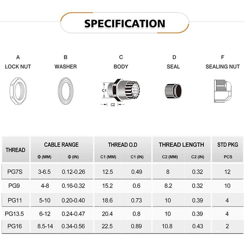 - ►Cable Range-PG7 (3 - 6.5 mm / 0.12 - 0.26 inch), PG9 (4 - 8 mm / 0.16 - 0.31 inch), PG11 (6 - 10mm / 0.24 - 0.39 inch), PG13.5 (7 - 12 mm / 0.28 - 0.47 inch), PG16 (8.5 - 14 mm / 0.33 - 0.55 inch);