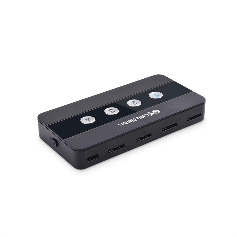 - Share Four USB Peripherals Between Four Hosts: The Cable Matters 4 Port USB 3.0 Switch selector is the ideal solution for sharing up to four USB peripherals with up to four separate computers; Use the USB KVM to eliminate the need for swapping cables and peripherals between desktops, laptops, and other equipment; Four host buttons allows the USB switch selector to swap between hosts with a single button press of the USB toggle switch
