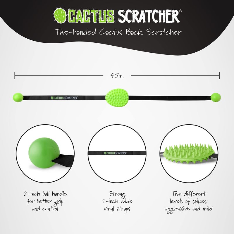 - INSTANT RELIEF: Relieve itches and exfoliate your skin with our original cactus back scratcher for men and women! Power-grip ball handles make it easy to apply pressure, and 45-inch straps reach difficult spots without causing additional shoulder and muscle pain.