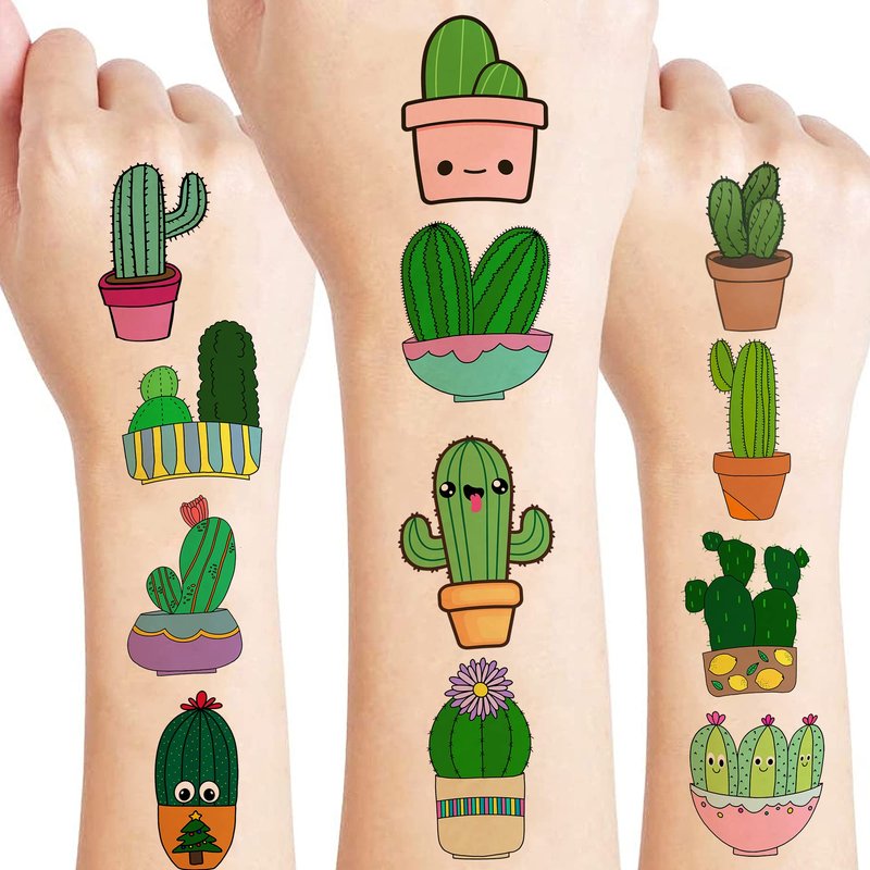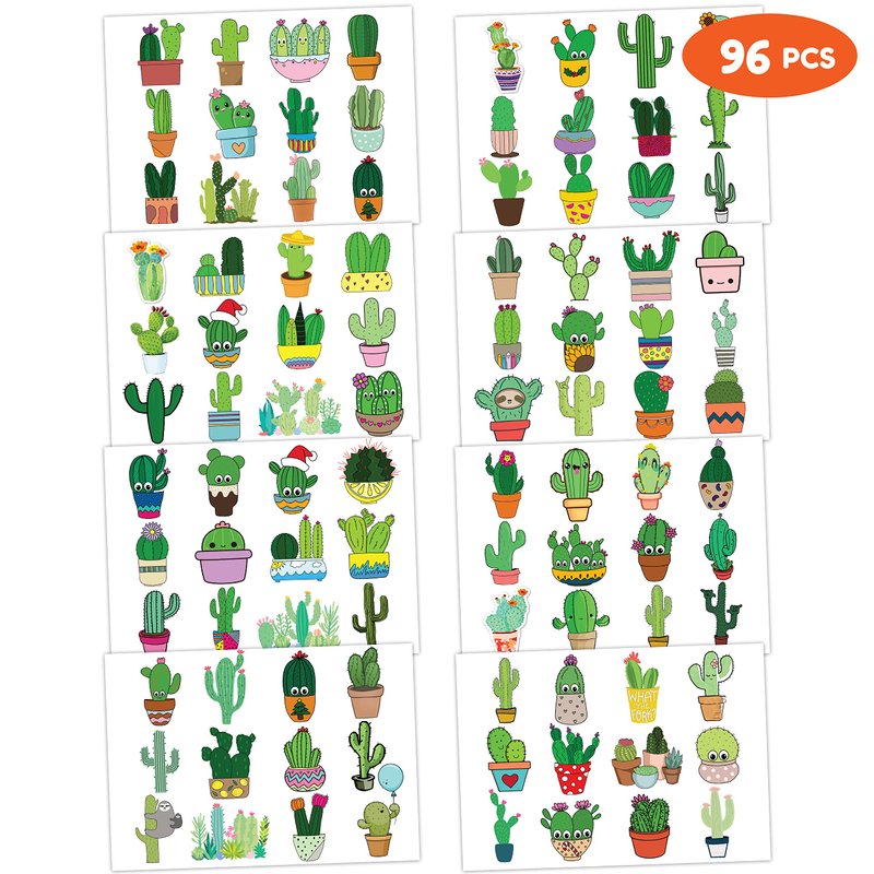 - šµćPERFECT TATTOOS FOR THEMED CACTUS DECORATIONSć: Cactus tattoos stickers retaining to our popular collection will meet the requirements that children all over the world need at Birthday parties, Christmas, and special celebrations. Each tattoos set covers 8 sheets in total with 96 Pcs. The size of each tattoo sheet is 6.1 * 3.1 inches, one size fit for adults to kids. The numerous formed cactus plant pot sticker designed to vibrant color will promise to develop the cute beauty for parties.