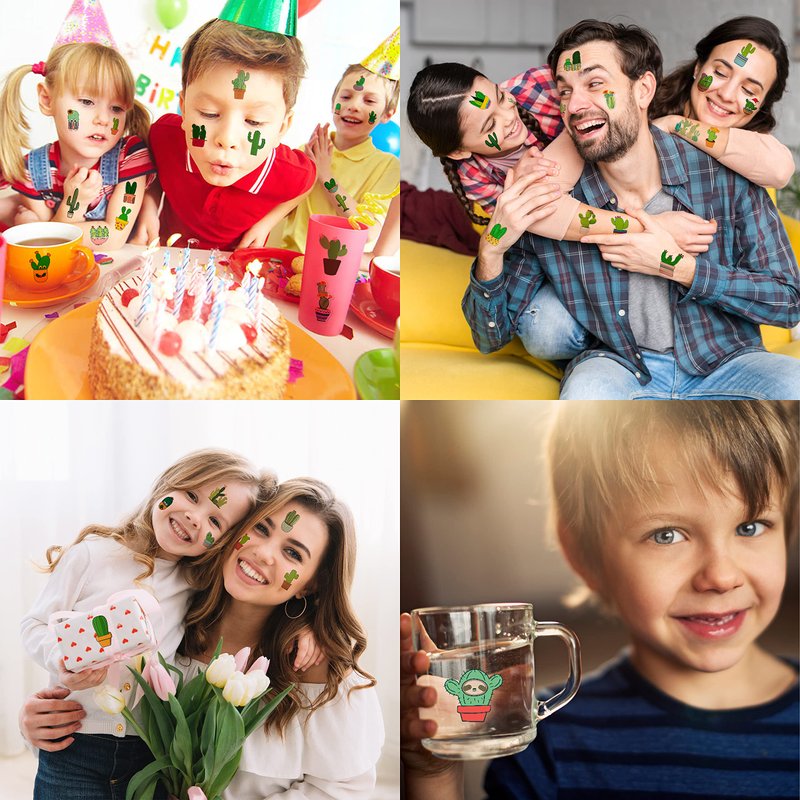 šµćPERFECT TATTOOS FOR THEMED CACTUS DECORATIONSć: Cactus tattoos stickers retaining to our popular collection will meet the requirements that children all over the world need at Birthday parties, Christmas, and special celebrations. Each tattoos set covers 8 sheets in total with 96 Pcs. The size of each tattoo sheet is 6.1 * 3.1 inches, one size fit for adults to kids. The numerous formed cactus plant pot sticker designed to vibrant color will promise to develop the cute beauty for parties. šćGREAT GIFT IDEAS FOR CACTUS BIRTHDAY PARTY SUPPLIES, DECORATION, FAVORSć: Cactus themed happy birthday is the reasonable topic for outdoor activities in special occassions that children always anticipate to find the entertainment through the moments of parties. Flower plant pot with water storing stems is the so-called cactus will creating the fresh and bright party with green main color. š„³ćADD A TOUCH OF FUNć: Are you tired of mundane gifts? We've got you covered! Our collection of adorable and vibrant temporary tattoo designs can be applied to laptops, backpacks, desks, suitcases, books, water cups, and more. These playful elements will surely elevate your visual experience and bring a touch of joy to everyday items. šćSAFE AND HIGH QUALITYć: Our temporary tattoos are made of environmentally friendly materials, and non-toxic, These tattoos are made of high-quality safety and green paper š“ćEASY TO USE AND REMOVEć: Cut each tattoo out of sheets and remove the sheet clearly. You can stick it on hands, face, arms or wherever you feel safe. Moreover, you put it down on glasses, clothes, and a smooth flat . After that, you wet it thoroughly with water and wait for 20-30 seconds, you get rid of the backing paper. As a result, you have a velvety tattoo as we say šćPERFECT SERVICEćIf you have difficulty using our product, contact us. We will make sure to solve problems and help you have a wonderful buying experience