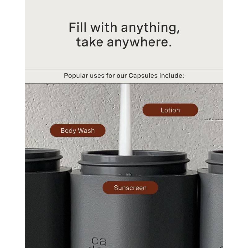 Cadence Travel Containers - Body Care Capsule Set - Magnetic Travel Capsules - For Body Wash, Lotions, Sunscreens - 3 Flex Mediums (1.32oz) with Body Wash, Lotion, & Sun Icon Labels - Eucalyptus