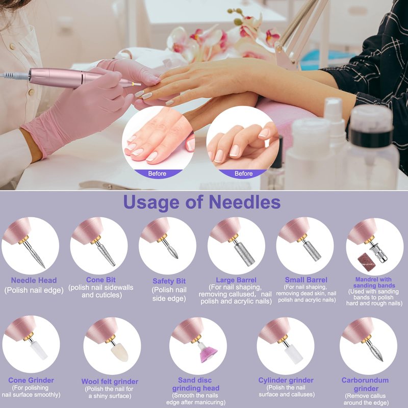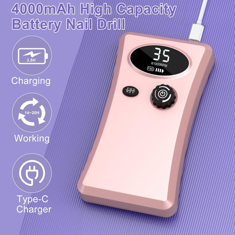 - 【Rechargeable Nail Drill Bits】This rechargeable electric nail file machine, comes with a large capacity battery 4000mAh, which charges for about 3.5 hours, can be used for up to 12 hours. The professional nail drill is equipped with a delicate lock drill, which has high compatibility and concentricity, so you don't have to worry about about the nail drill bit falling off.
