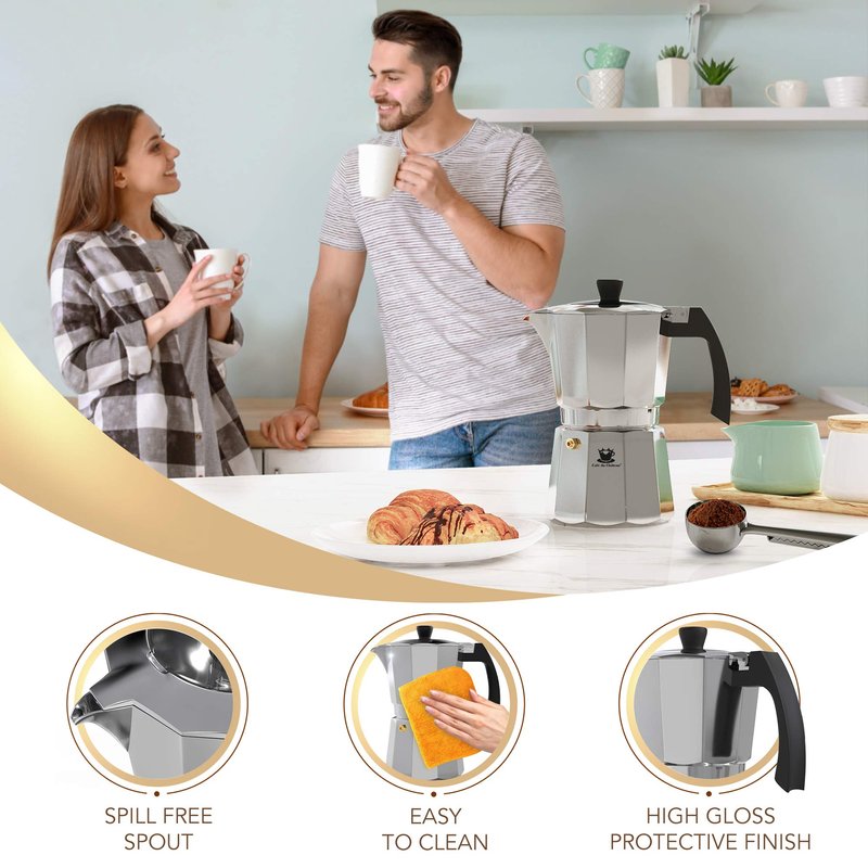 - Easy Grip Handle Helps Avoid Burns: Our stove top espresso coffee maker's handle is durable and bends away from the hot espresso pot giving your hand and knuckles ample space to avoid burns. The base of the italian coffee maker also features a safety valve that allows excess steam to flow out of the base