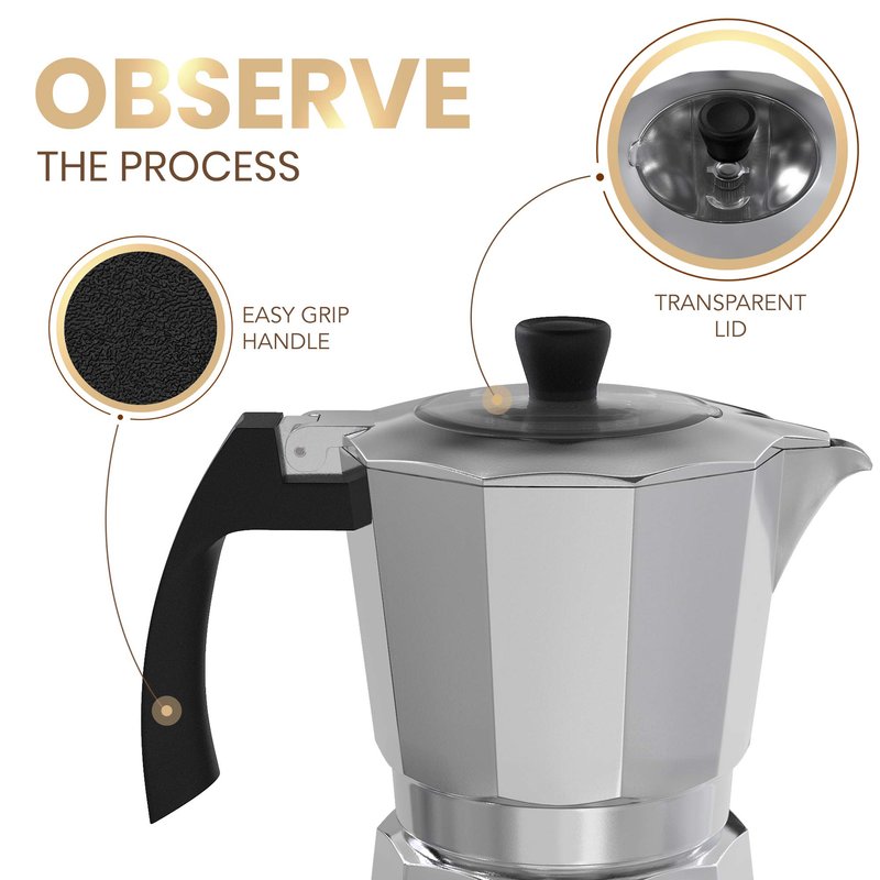 - Transparent Top Lid for Easy Viewing: Our stovetop espresso maker, or moka pot, features an innovative transparent top lid so you're able to see when your espresso is ready without needing to lift the lid. This helps to avoid unnecessary spills and burns that are common with other espresso makers