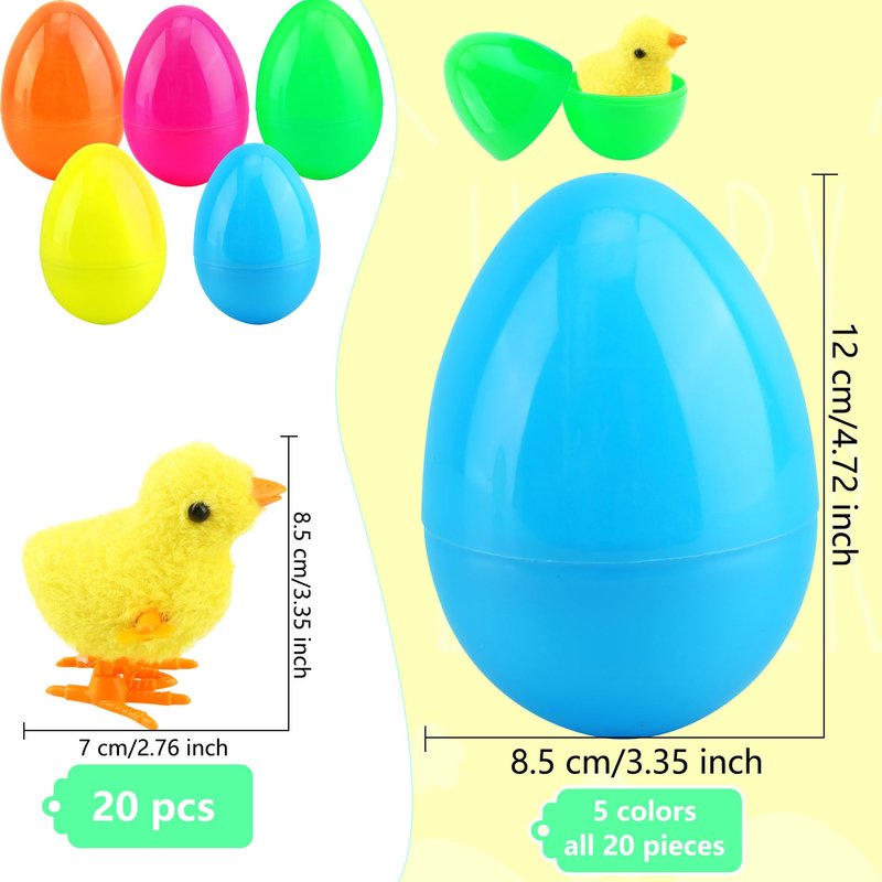 - Size details: these Easter eggs measure approximately 9.5 x 7.5 cm / 3.74 x 2.95 inches and the wind-up chick measures approximately 8 x 5.5 x 8.5 cm / 3.15 x 2.17 x 3.35 inches. Easter eggs hold Easter chicks perfectly and are a great addition to your Easter egg hunt
