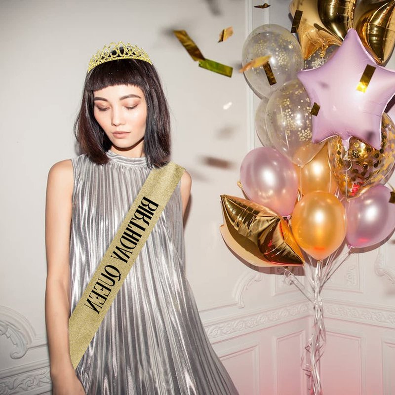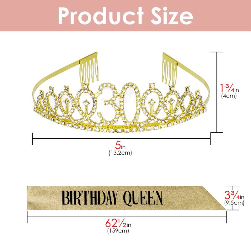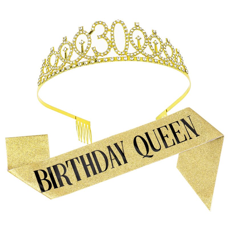 - Package includes: 1 x gold thirty birthday tiara, 1 x glitter golden birthday queen sash for women 30th, comes with a greeting card and ribbon for gift wrapping.