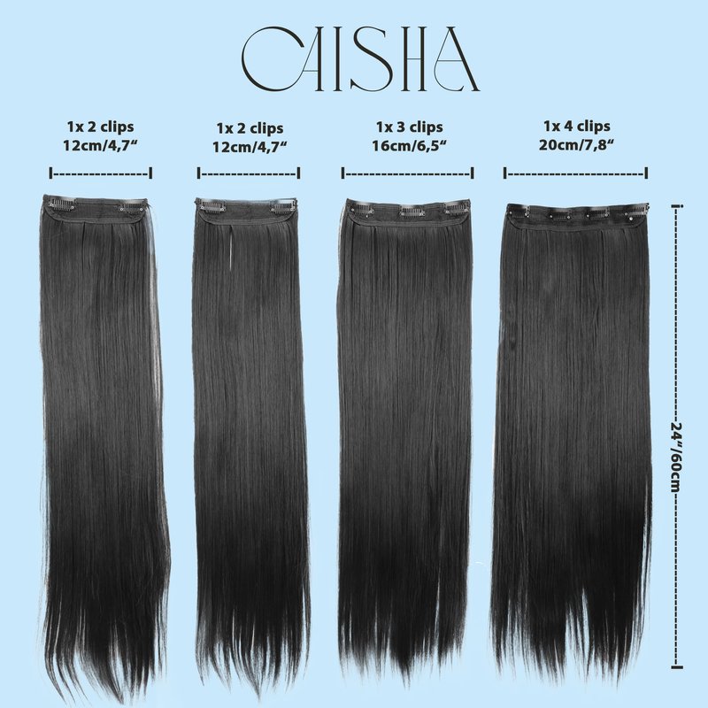 High-quality heat-resistant synthetic fiber up to 130°C, washable, feels like real hair. 4 pieces SET with a total of 11 clips, weight: 0.62 lb (280g); 2 pieces approx. 12cm with 2 clips each; 1 piece approx. 16cm with 3 clips, 1 piece approx. 20cm with 4 clips . Length of wavy condition: 18" (45cm), length of straight condition: 24" (60cm), Easy to use with the help of clips. Comb after receipt to get the final shape and color. Hair residues can then be easily brushed out. For optimal color selection - comparison on several high-resolution screens is recommended due to the different reproduction quality.