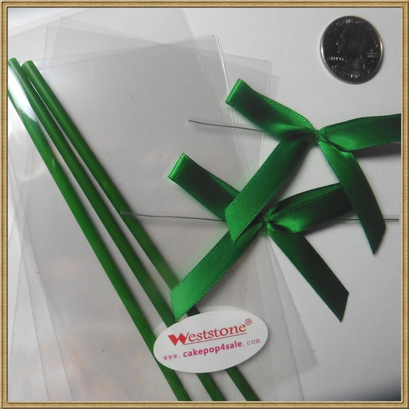 Cake pop sticks clear bags colorful ribbon bows (green)