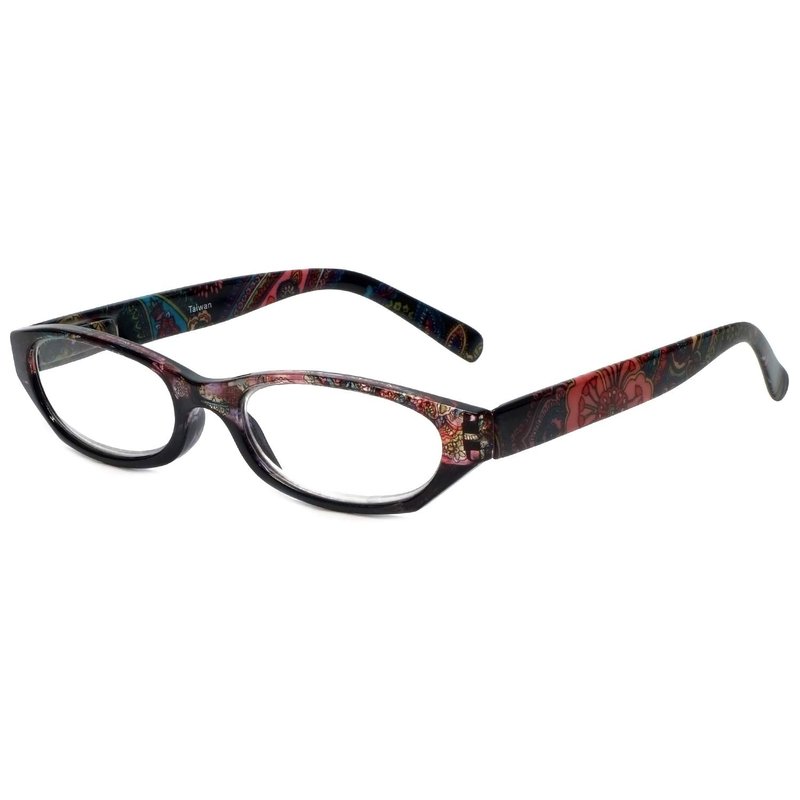 Meet the Calabria 4377 Oval Cat Eye Reading Glasses, where functionality meets fashion. Uniquely designed for women, these reading glasses feature an aesthetically pleasing oval cat-eye shape that is universally flattering. The frames are adorned with a unique, vibrant, floral paisley pattern, bringing a splash of color to your look. Available in three color variants: black for a timeless look, brown for a warm, earthy feel, and pink for a playful and youthful touch. Built with sturdy plastic frames and lenses, these glasses ensure durability and resilience for everyday use. The frame measures 5.5 inches in width, while the lens width is 51 millimeters, and the lens height is 1.25 inches. These measurements have been carefully selected to offer a comfortable, snug fit. What sets these glasses apart is their comfort-centric design. The spring-hinge temples allow for adaptability, providing a perfect fit for a wide range of face shapes and sizes. Furthermore, the spring hinges enhance durability, ensuring the glasses maintain their optimal fit over prolonged use. Offering 17 different magnification options, ranging from +0.50 to +6.00, the Calabria 4377 meets a multitude of vision correction needs. Whether your requirement is minimal or significant, you will find the perfect fit with these glasses. Each pair of the Calabria 4377 comes with a complimentary soft, suede drawstring pouch that matches the color of your frames. This pouch is not just a stylish accessory, but a functional one, providing a convenient and secure place to store your glasses when they are not in use. Embrace a combination of style, comfort, and precision with the Calabria 4377 Oval Cat Eye Reading Glasses. Enjoy superior vision clarity without compromising on your style. These glasses are not just a visual aid; they are a fashion statement.