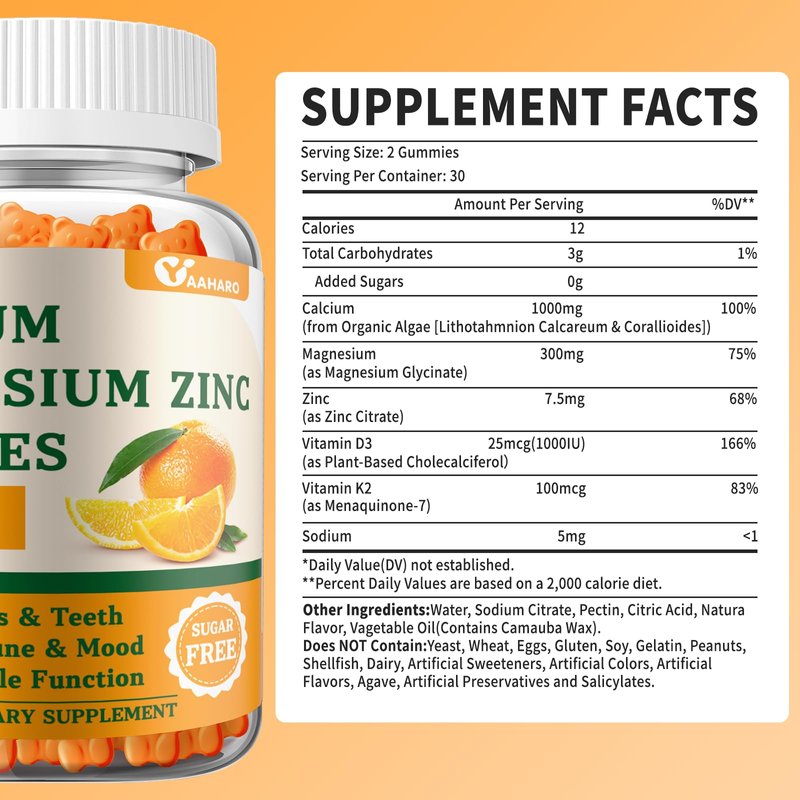 - Bone & Immune Support: Our Calcium Magnesium Zinc Gummies are carefully crafted with algae calcium, magnesium glycinate, zinc, and vitamins D3, K2. Algae-derived calcium is 5 times more bioavailable and easier to absorb. Each serving of gummy provides a balanced blend of calcium, magnesium, and zinc to support bone health, muscle function, and the immune system, helping you maintain optimal health and wellness