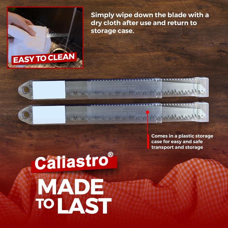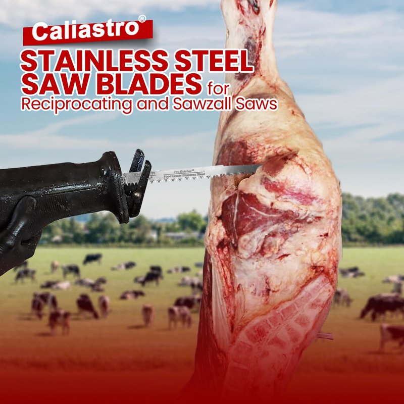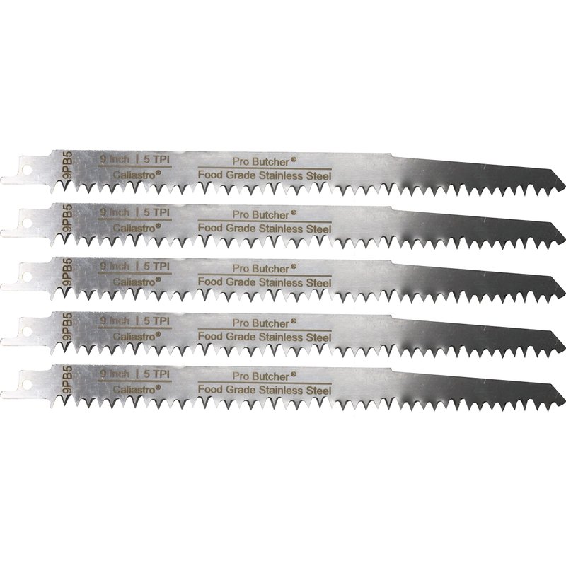 Butcher Reciprocating Saw Blades made of Food Grade Stainless steel, 9 inch - 5 pack at 5 teeth per inch. Caliastro's Butcher Saw Blades are specifically engineered for faster cutting and added durability, that will easily cut frozen animal meat and bone including deer / venison, cow / beef, sheep / lamb / mutton, pig / pork, chicken, turkey, fish and others