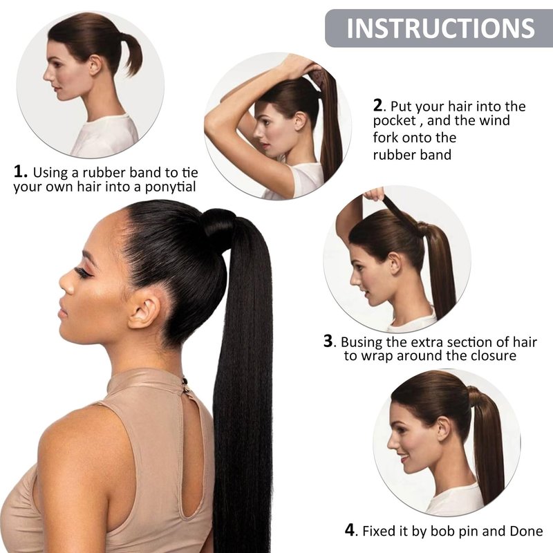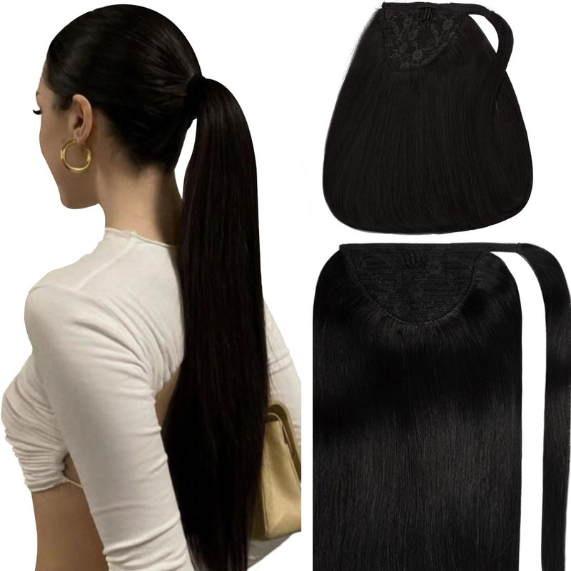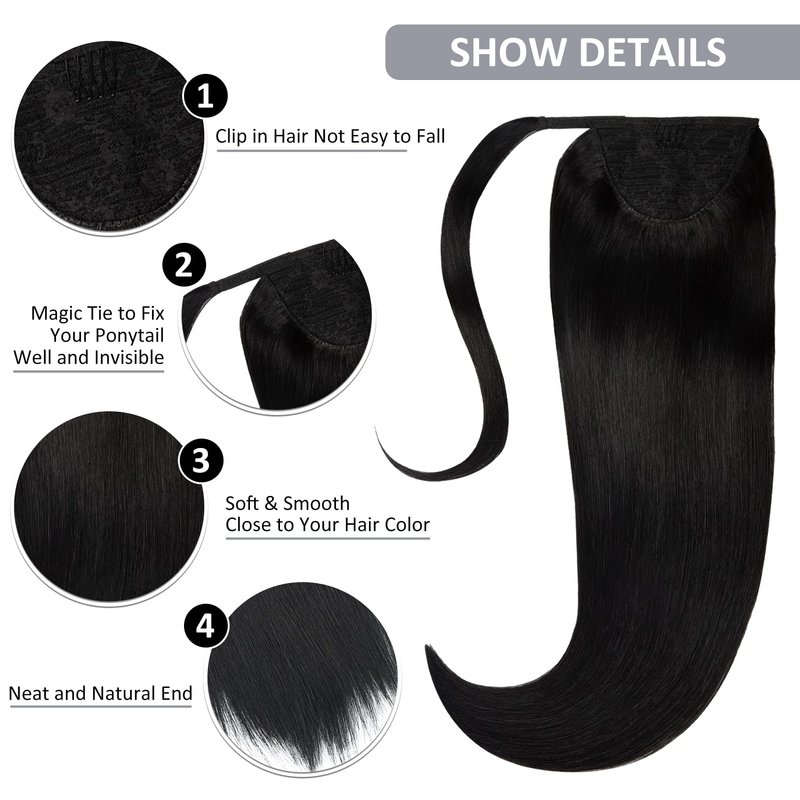 - ♛【Super Easy to Wear】— The Jet Black Ponytail Human Hair Extensions comes with an easy install clip-in comb and velcro with hair ties.Just wrap/tie it around your own ponytail and you will get a long thick pony tail magically.