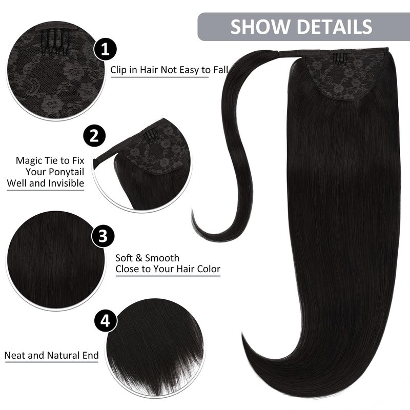 - ♛【Super Easy to Wear】— The Black Ponytail Human Hair Extensions comes with an easy install clip-in comb and velcro with hair ties.Just wrap/tie it around your own ponytail and you will get a long thick pony tail magically.