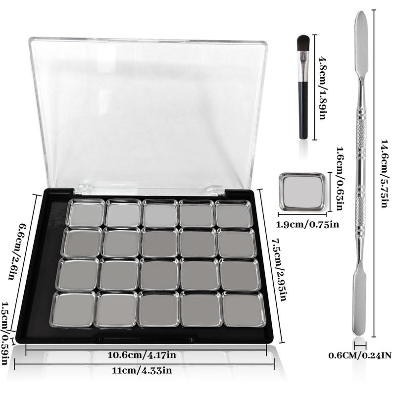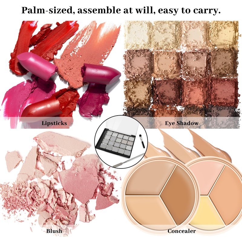 - 【DIY Magnetic Makeup Palette Set】:The strong magnetic makeup tray contains 20 Pcs small iron trays, an eye shadow brush, and an eye shadow knife. DIY your favorite blush, eyeshadow, lipstick, eyebrow powder, or other makeup on this large clear plastic empty palette.