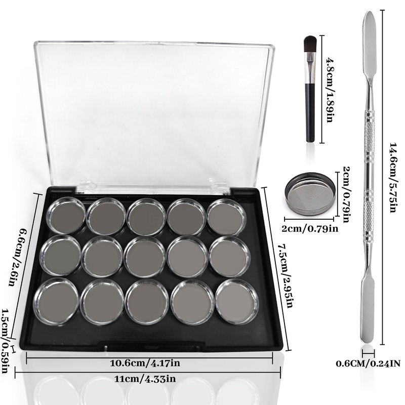 【 Package 】 One makeup tray, 15 small iron trays, one eye shadow brush, and a small shovel.