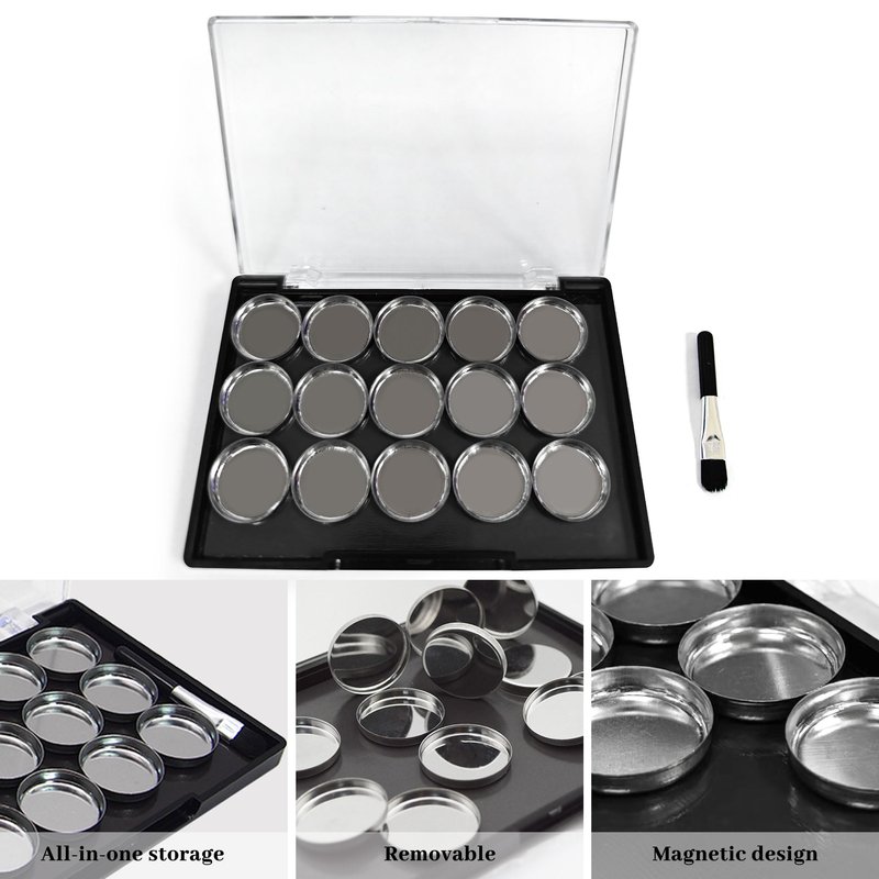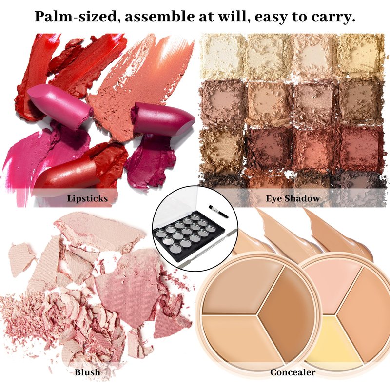 - 【DIY Magnetic Makeup Palette Set】:The strong magnetic makeup tray contains 15 Pcs small iron trays, an eye shadow brush, and an eye shadow knife.DIY your favorite blush, eyeshadow, lipstick, eyebrow powder, or other makeup on this large clear plastic empty palette.