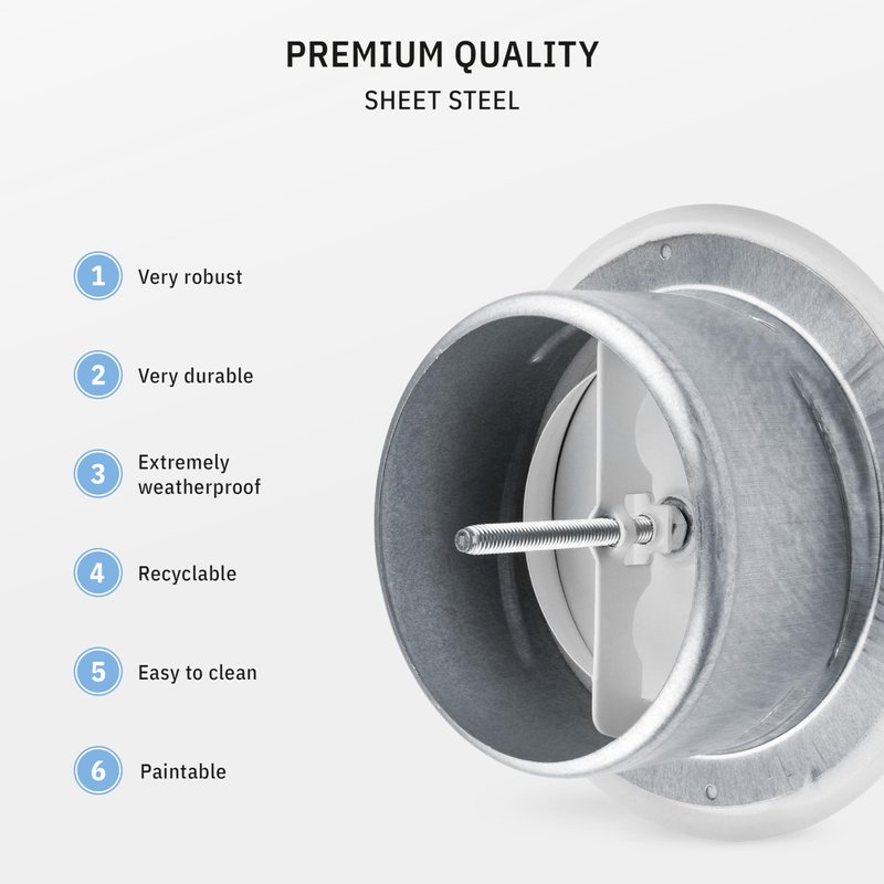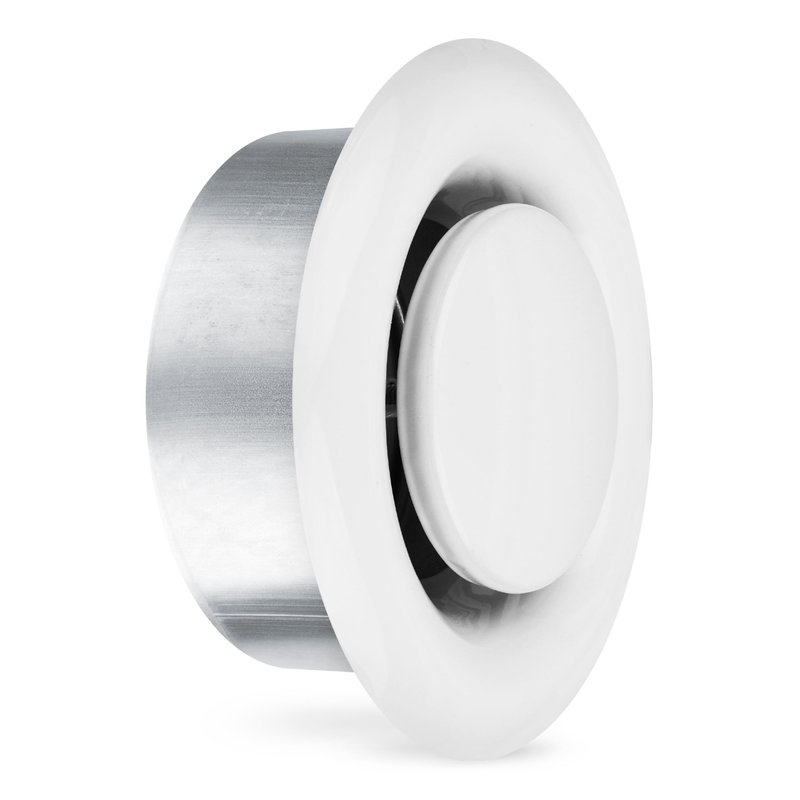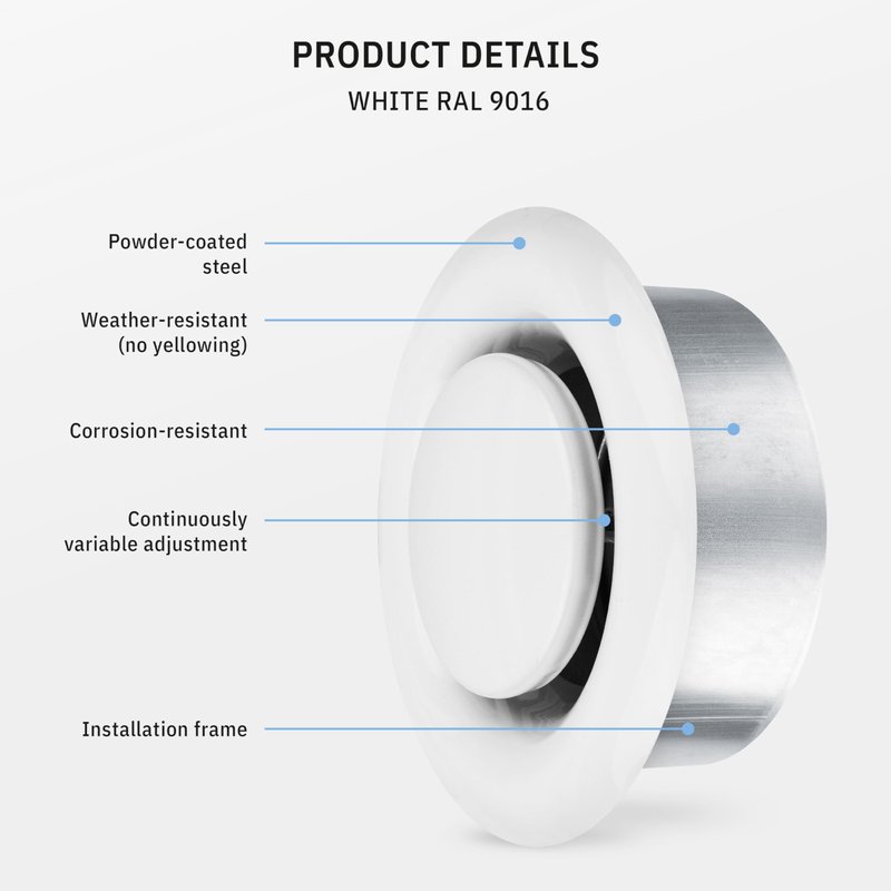 - ✔️ FEATURES The easy installable 4” steel valve in white (RAL9016) with mounting frame has an adjustable, centrically arranged, rotatable front plate which you can vary the outflow of air. The outside diameter of the grille is 5.5 inches