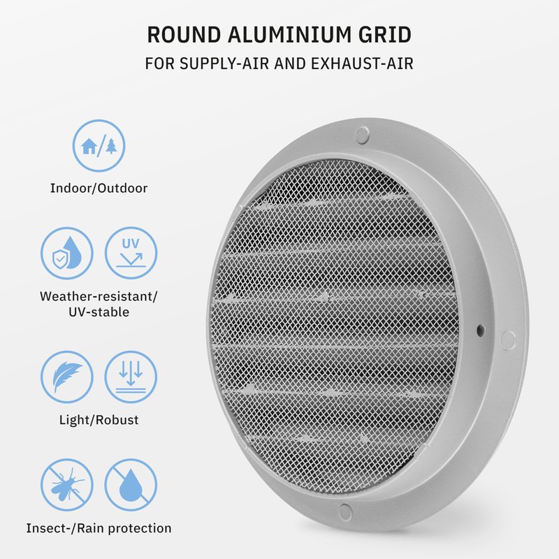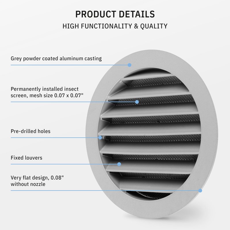 - 👍 WELL MADE This calimaero WSGG 5" vent cover is made from cast aluminum, very robust and lightweight with a very flat design 5mm without socket. The 2x2mm weatherproof screen mesh helps block dust from entering. Very efficient, value for money, and works both outdoors and indoors for home and office.
